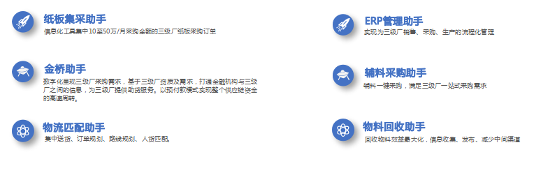 技术端:进行产品开发,向产业链上游延伸,提供整体线上供应链服务(采购、销售、物流仓储、金融、信息化),推进纸板行业产业链的颠覆性升级。