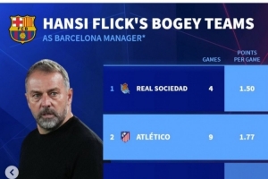 弗里克执教巴萨以来克星排名(至少对阵3场):